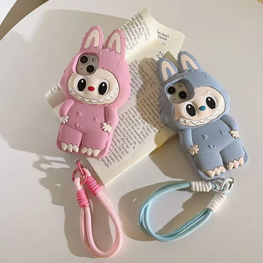 3D Cartoon Kawaii Monster Rabbit Soft Silicone Phone Case For iPhone 16 15 14 Plus 13 12 11 Pro Max 16promax With Lanyard Cover
