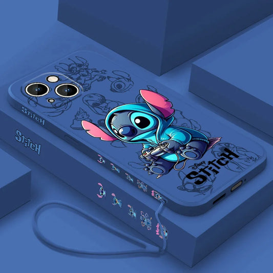 Stitch LOVE Flowers Cover For Apple iPhone 16 15 14 13 12 11 8 7 Pro mini Max Plus Liquid Left Rope Soft Phone Case