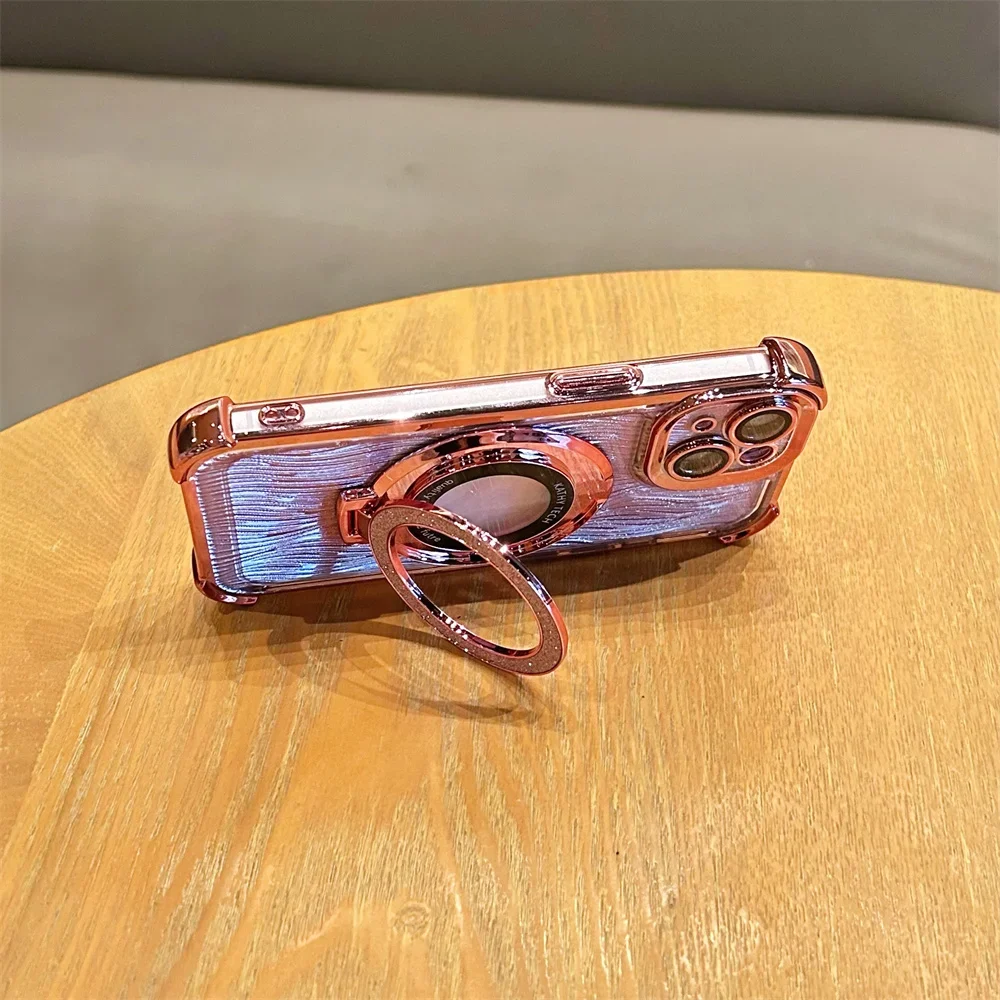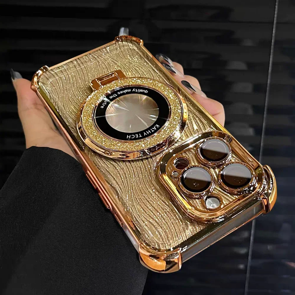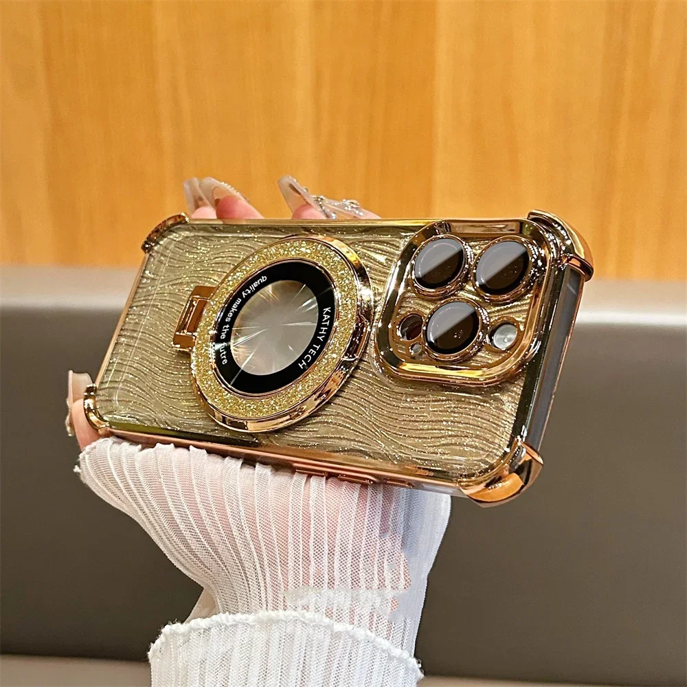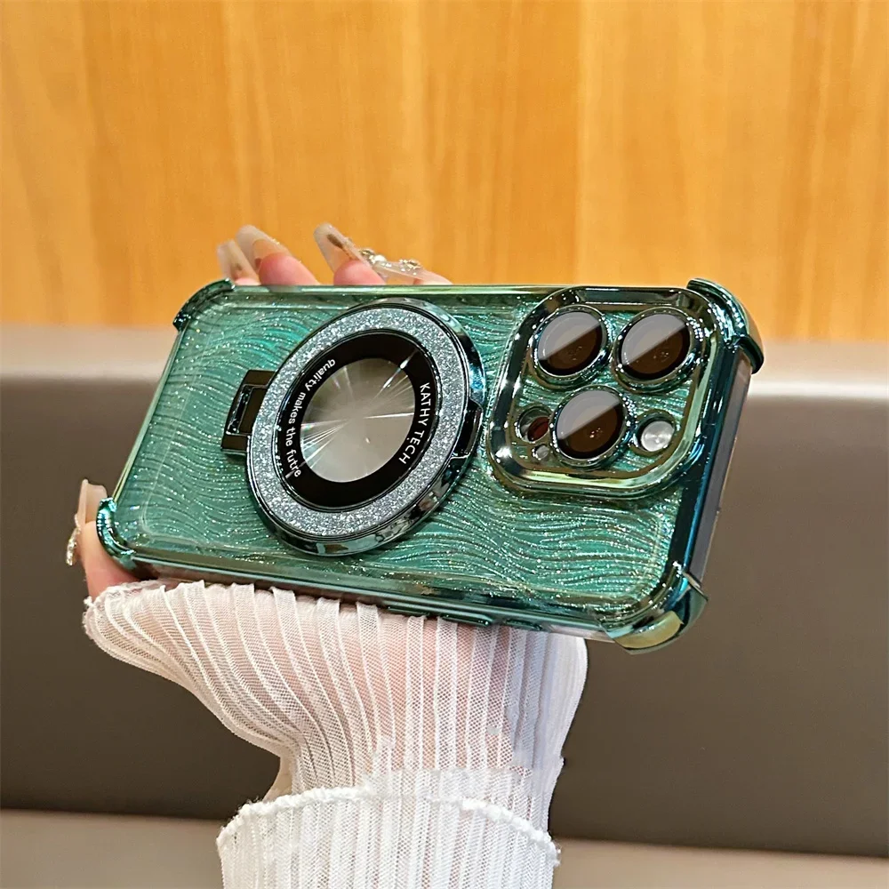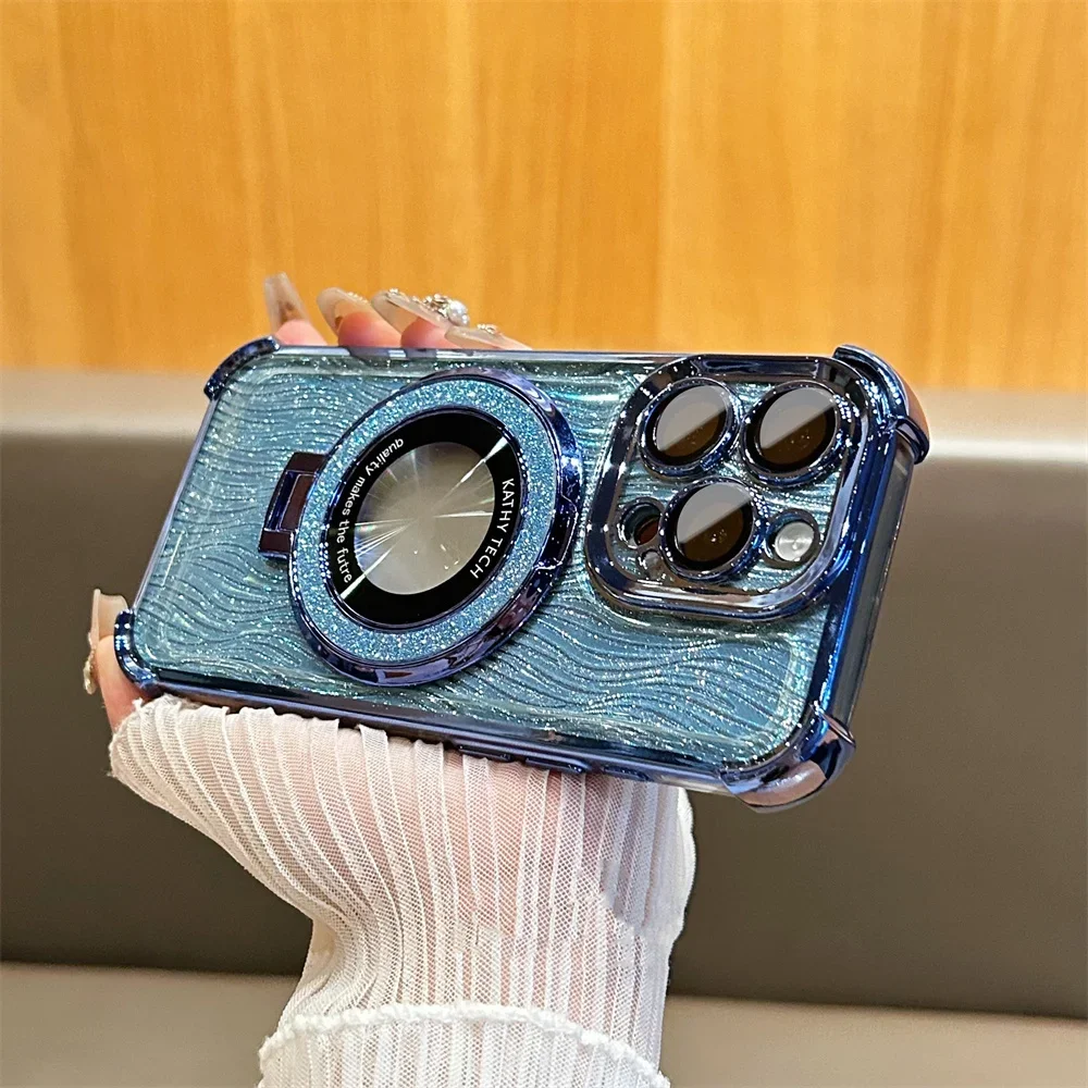 Glitter Water Ripple Logo Hole Magnetic Stand Case for iPhone 17 Air 17 16 15 14 13 12 11 Pro Max Plus Airbag Shockproof Cover