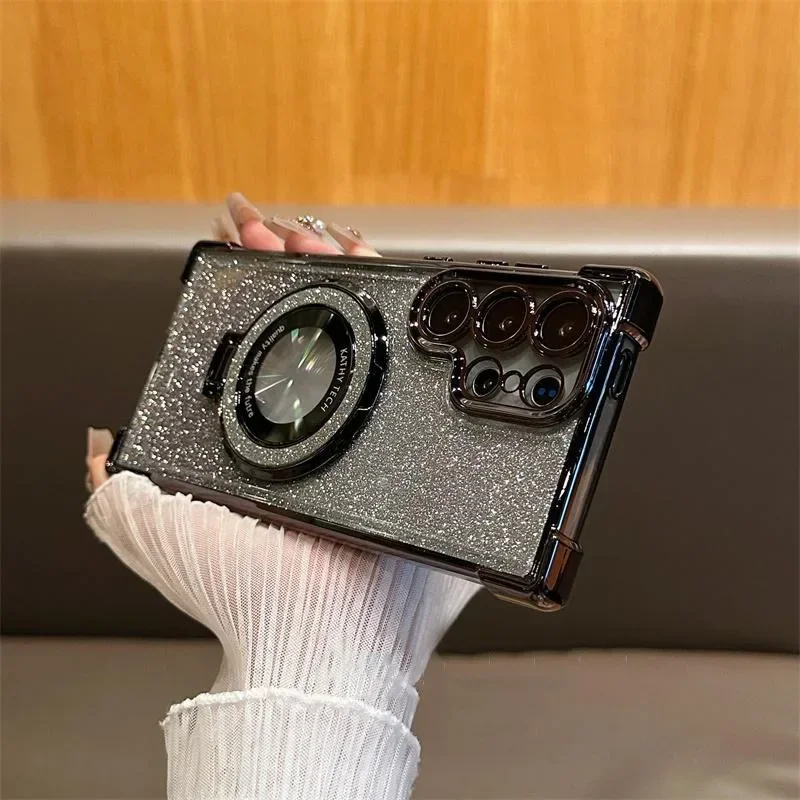 for Magsafe Glitter Bracket Case for Samsung Galaxy S25 FE S25 S24 Ultra S23 FE S22 Plus Note 20 Stand Holder Gradient Plating Bling Cover