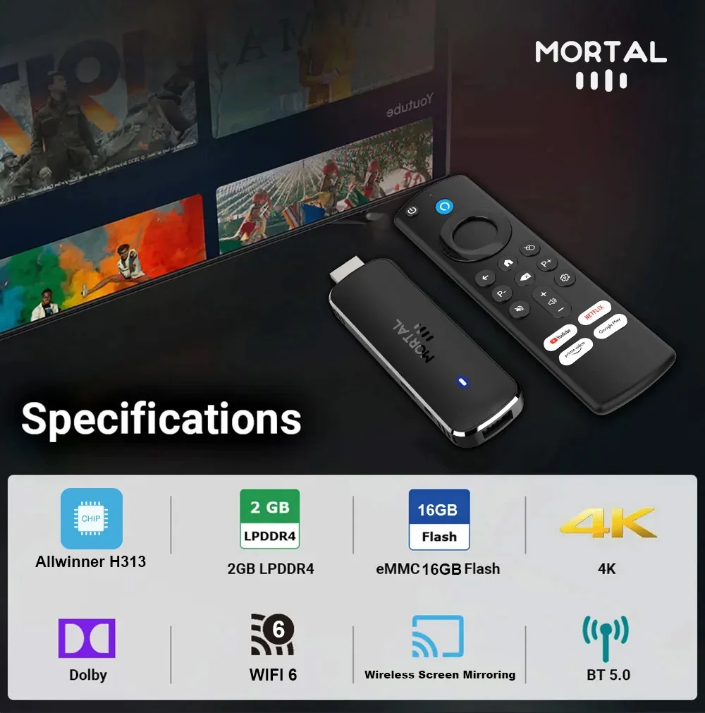 Mortal Q8 Android14 TV stick WIFI6 Voice Control TV stick 8K video Allwinner H313 Netflix YouTube Tv box Free Live TV Streaming